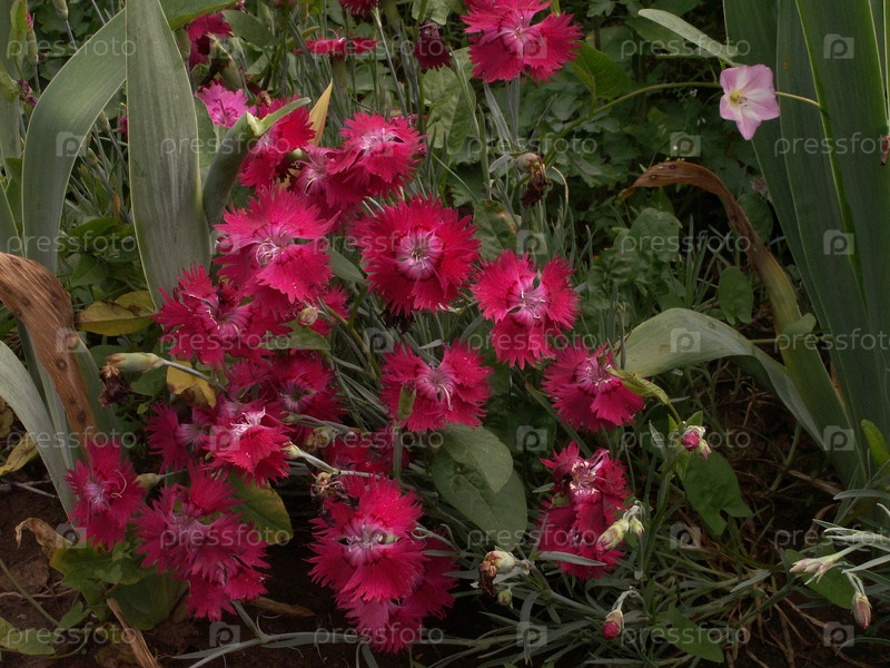 Розовые гвоздики на фоне зеленых листьев