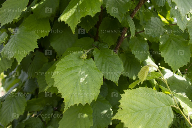 Листья зеленого орешника в саду летом