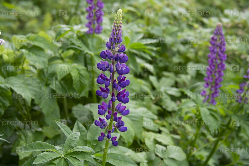 Фиолетовые люпины на размытом фоне зеленых листьев в саду летом