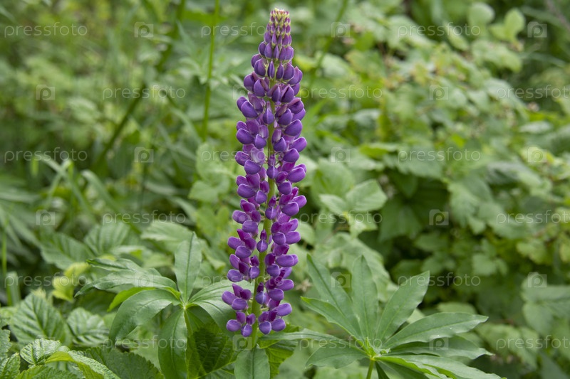 Фиолетовый люпин на фоне зеленых листьев