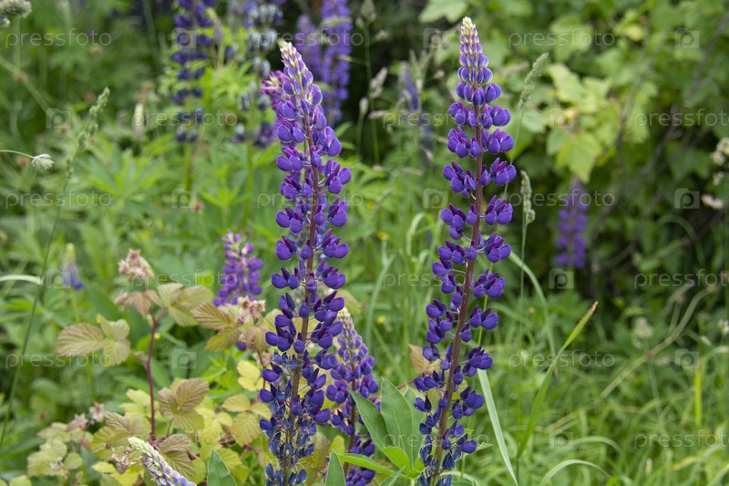 Фиолетовые люпины на фоне зеленых листьев в саду летом