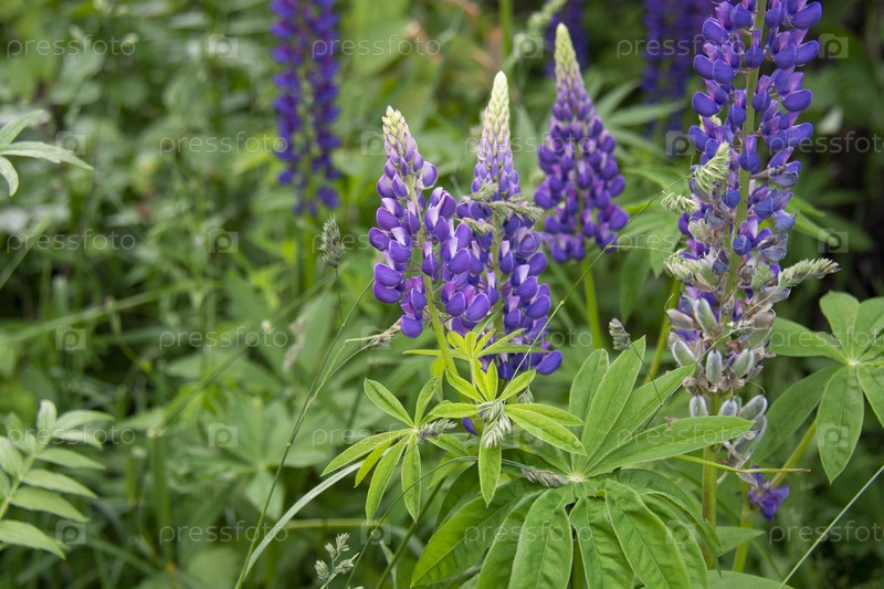 Красивые фиолетовые и синие люпины на фоне зеленых листьев в саду летом