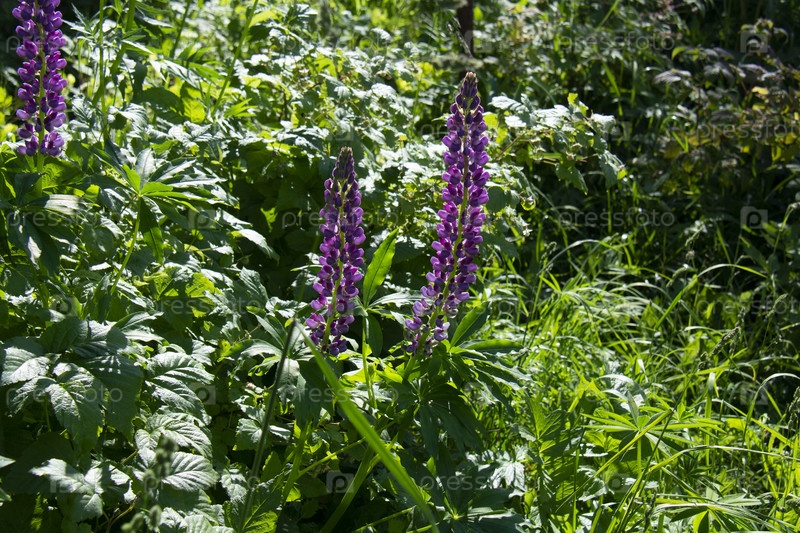 Фиолетовые люпины, освещенные солнцем, на фоне зеленых листьев в саду летом