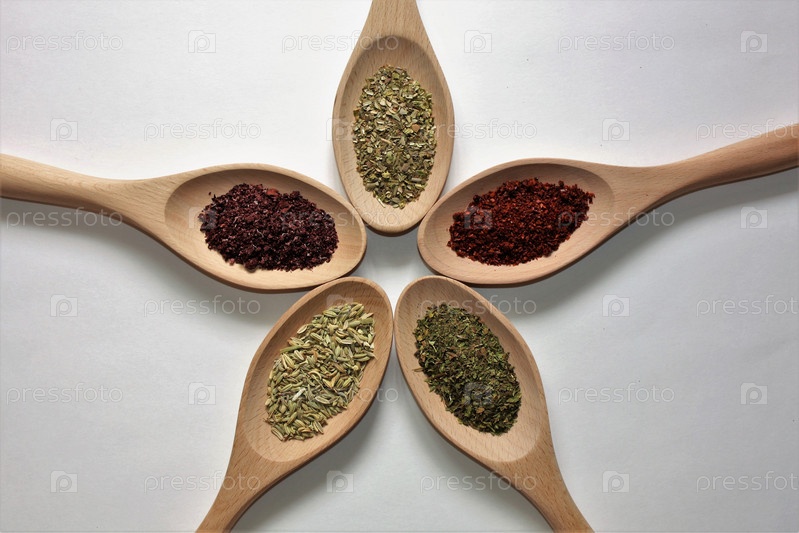 Различные специи для приготовления пищи в деревянных ложках на белом фоне: базилик, тимьян, фенхель, сумах, чили. Вид сверху
