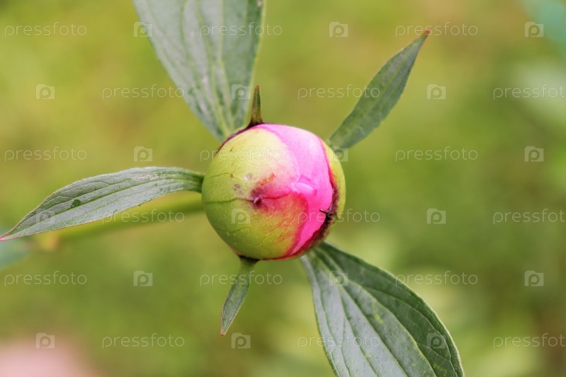 Яркий розовый бутон пиона на размытом фоне. Вид сверху