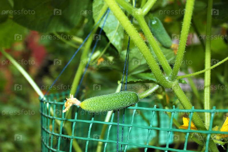 Молодой зеленый огурец на ветке. Созревание овоща. Натуральная еда крупным планом