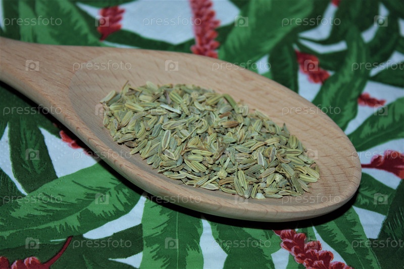 Изолированный сухой пряный и ароматный фенхель, приправа, в деревянной ложке на красочном фоне, кухонная бумажная салфетка. Вид сверху крупным планом