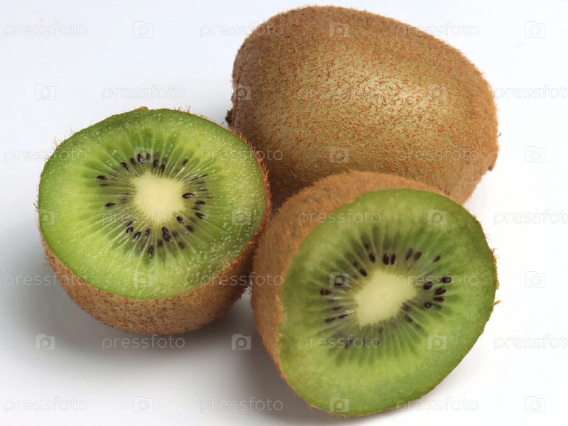 Один целый киви и второй киви, разрезанный пополам. Крупный план, светло-серый фон, выборочный фокус