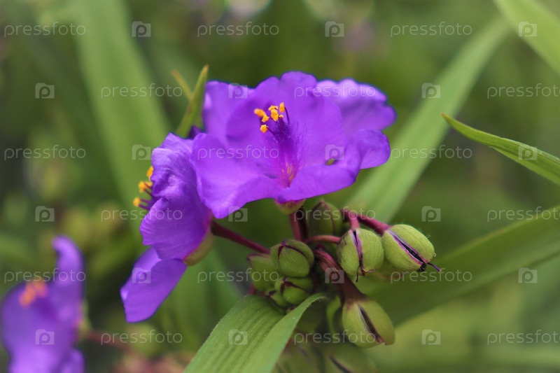 Крупный план красивого соцветия традесканции с бутонами и цветами, мягкий селективный фокус