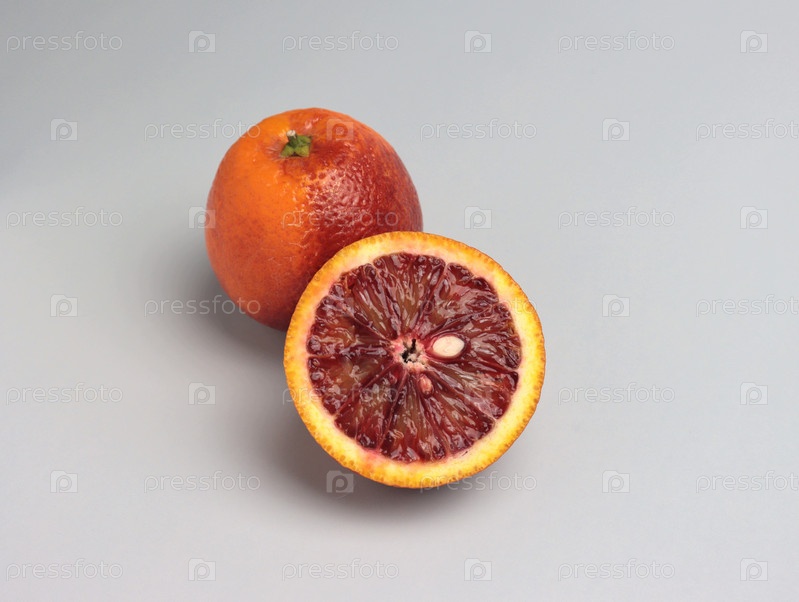Красный сицилийский апельсин - целый и разрезанный пополам. Крупный план, светло-серый фон, выборочный фокус
