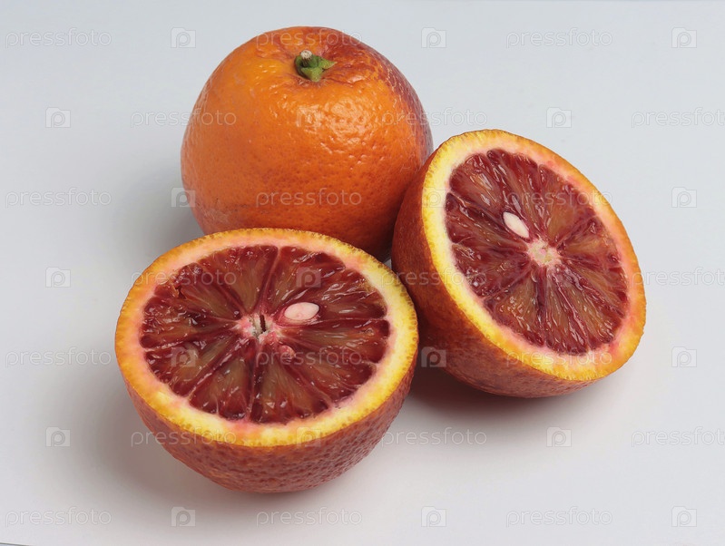 Красный сицилийский апельсин - один целый и второй, разрезанный на две половинки. Крупный план, светло-серый фон, селективный фокус