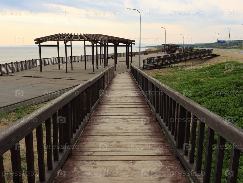 Деревянные конструкции типа беседки и деревянной дорожки к ней на побережье Охотского моря на Сахалине