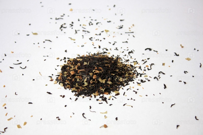 Куча черного листового чая на белом фоне, изолировано, вид сверху