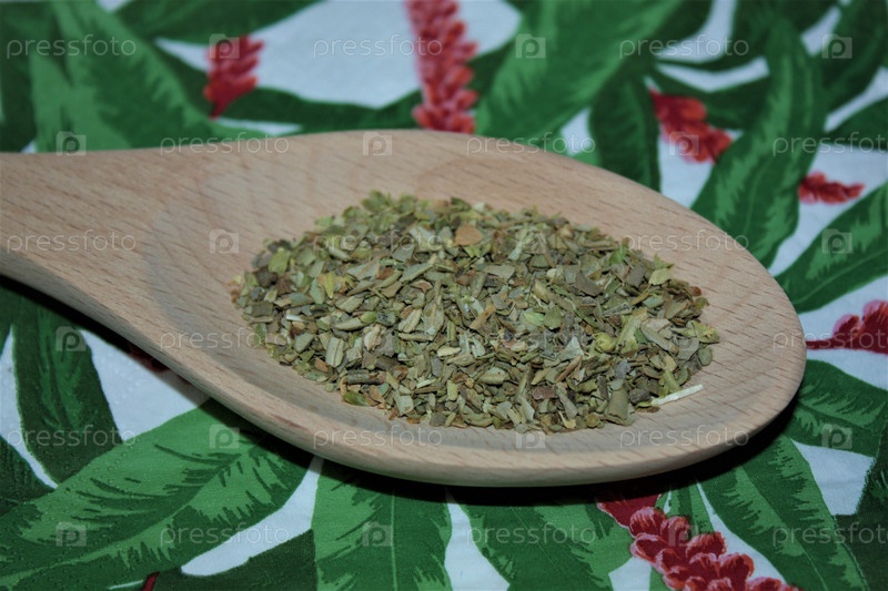 Изолированный сухой пряный и ароматный тимьян (приправа) в деревянной ложке на красочном фоне (кухонная бумажная салфетка). Вид сверху, крупным планом