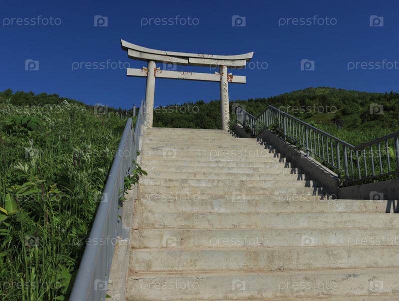 Ворота тории в селе Взморье на острове Сахалин с ведущей к ним лестницей на фоне голубого неба; выполнены из белого мрамора, вид снизу
