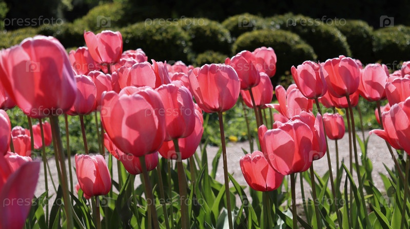 Множество ярко-розовых тюльпанов на клумбе в саду. Избирательный фокус
