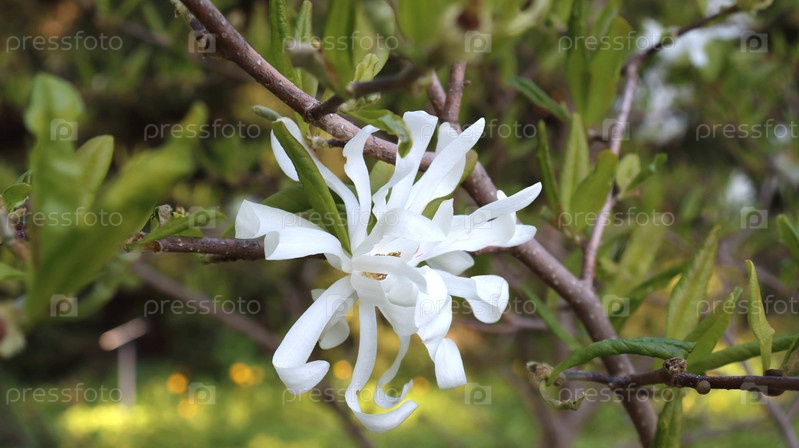 Цветок магнолии белой звезды на ветке дерева. Избирательный фокус, размытый естественный фон, крупный план