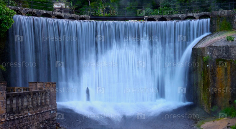 Новый Афон, Абхазия - июнь 2022 г. Самый известный водопад в Новом Афоне посреди древних стен. Эффект размытия воды