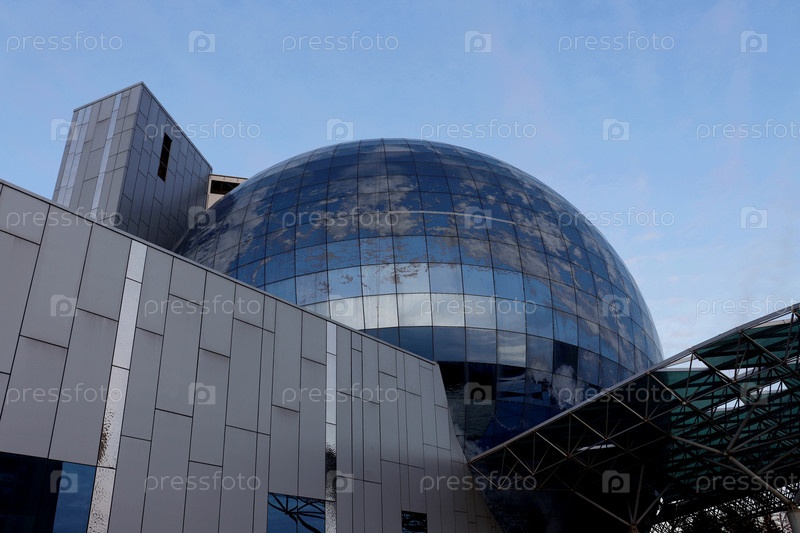 Вид снизу на экспозиционное здание «Планета Океан» — новое зеркальное здание-шар Музея Мирового океана в Калининграде с отражением облаков