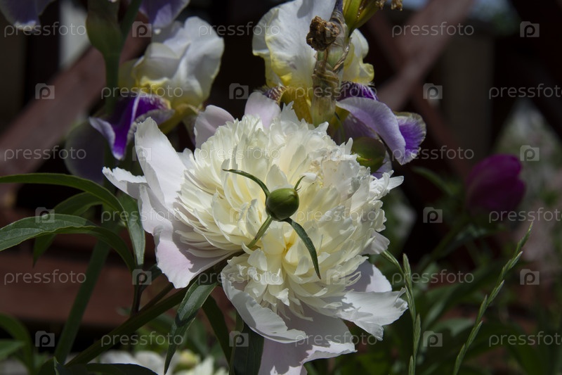Красивый белый пион и бело-фиолетовые ирисы в саду летом