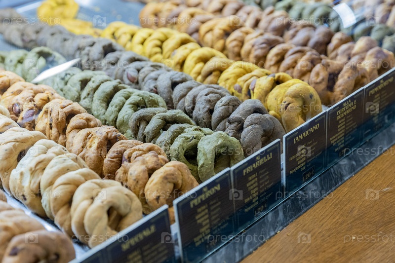 Италия. Неаполь. Витрина с бисквитами таралли. Италия. Неаполь. Витрина с бисквитками тарлли