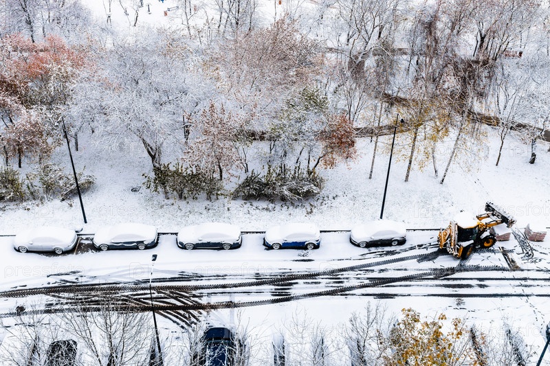 Вид с воздуха на первые припаркованные машины, покрытые снегом