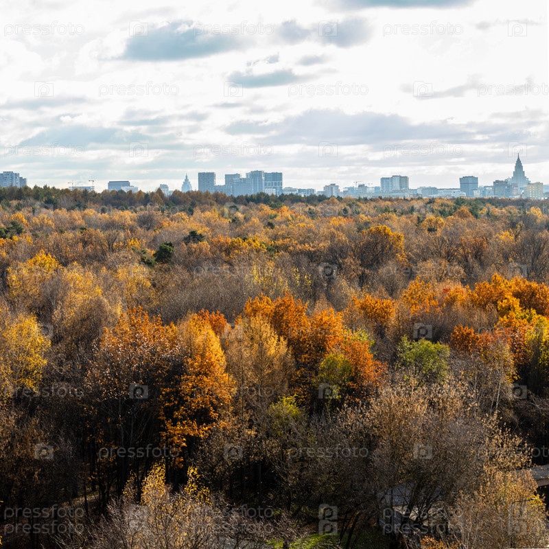 Серое облачное небо над красочным городским парком осенью