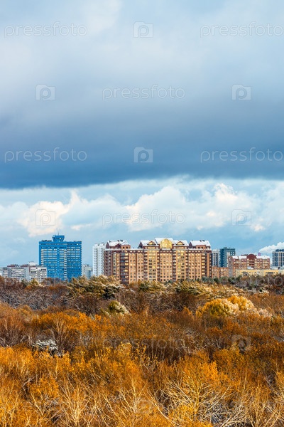 Темно-синее облако над городским парком, освещенное солнцем