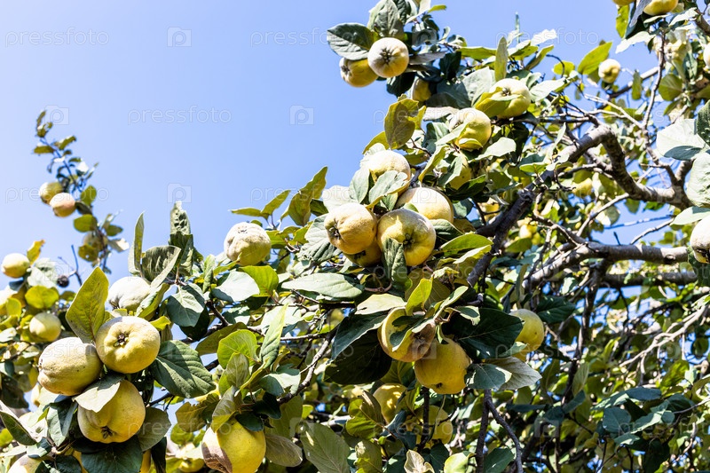 Много спелых плодов айвы на дереве в солнечный день