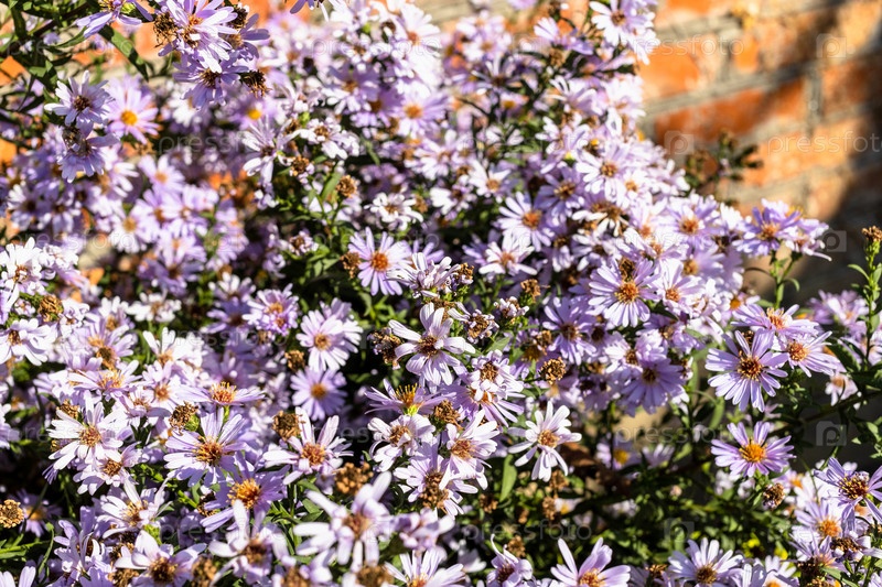 Куст астровых цветов возле стены сарая