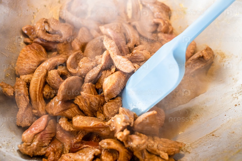 Помешивание жаренного мяса индейки силиконовой лопаткой