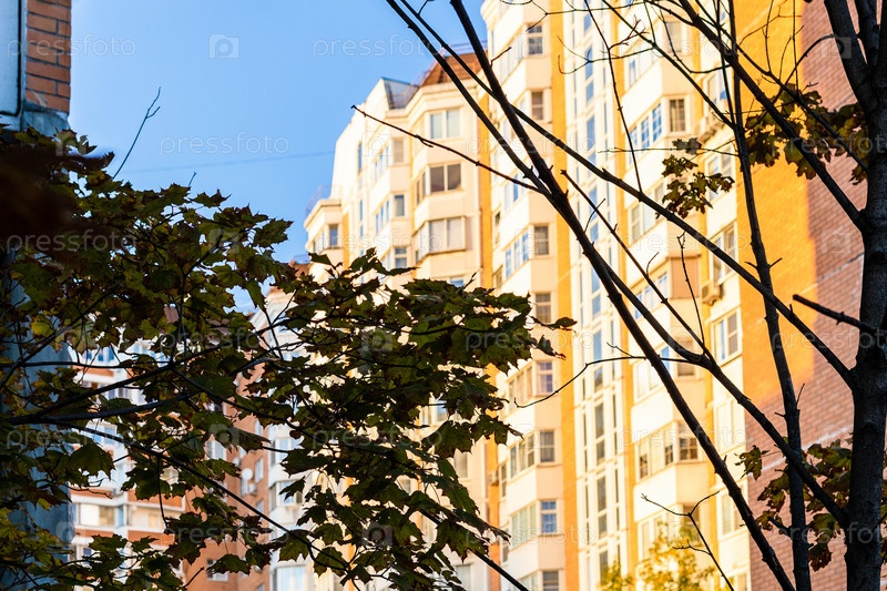 Кленовые листья и здание, освещенное солнцем