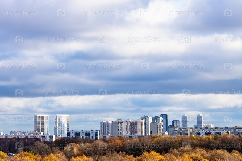 Низкое темно-синее облачное небо над красочным городским парком