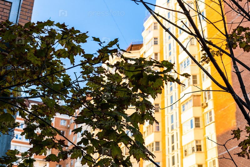 Осенние листья и многоэтажный дом, освещенный солнцем