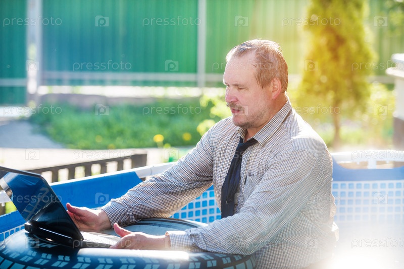 Деловой человек с ноутбуком работает в бассейне