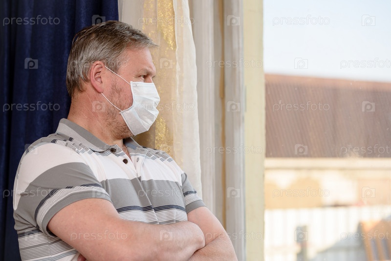 Грустный мужчина дома на карантине в медицинской маске смотрит в окно