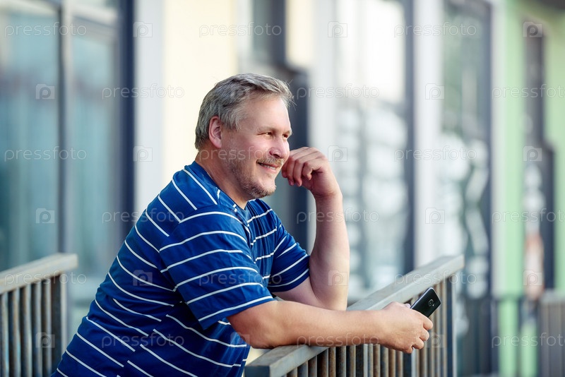 Довольный человек улыбается, глядя вдаль в городе. Концепция современной жизни в городе