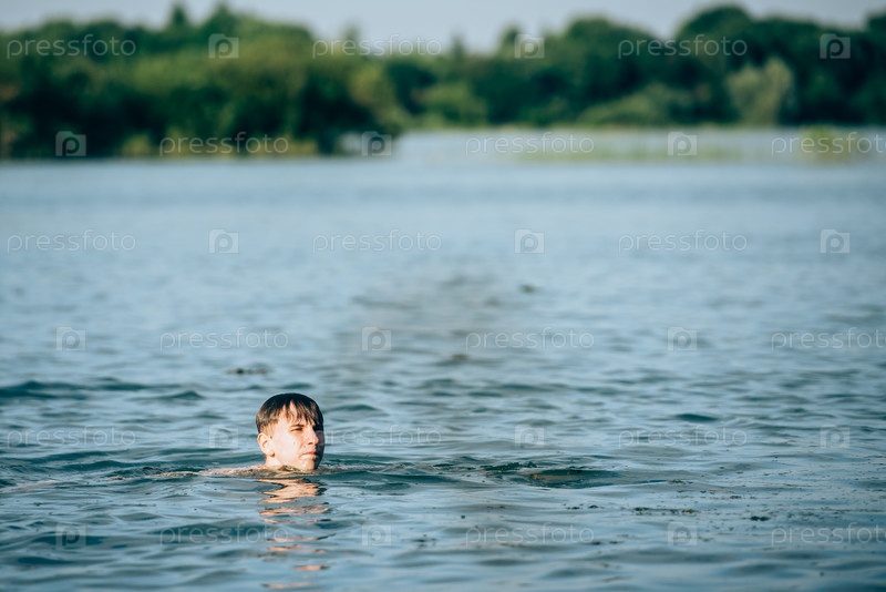 Мальчик плавает в озере летом - вид со спины