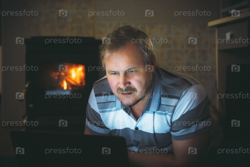 Мужчина смотрит контент на ноутбуке вечером дома у камина