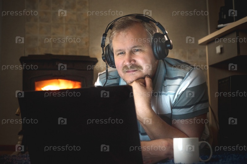 Мужчина в наушниках смотрит с ноутбука ночью на пол комнаты у камина, слушая музыку