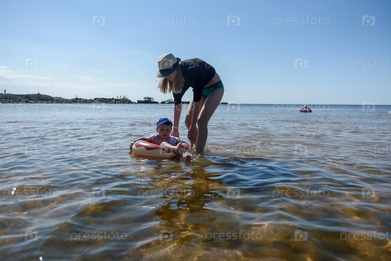 Маленький ребенок мальчик с мамой на пляже у озера