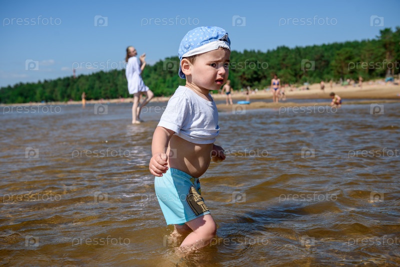 Маленький ребенок мальчик на речном пляже летом
