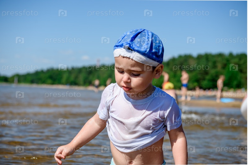 Маленький ребенок мальчик на речном пляже летом