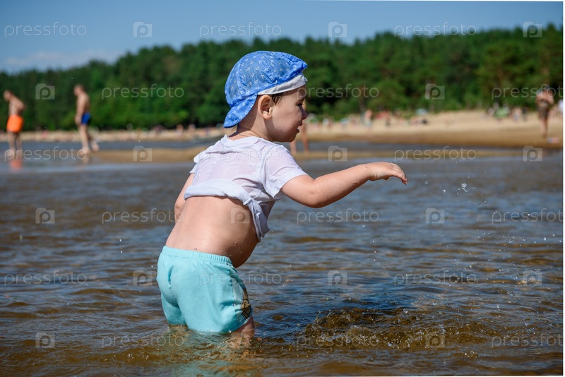 Маленький ребенок мальчик на речном пляже летом
