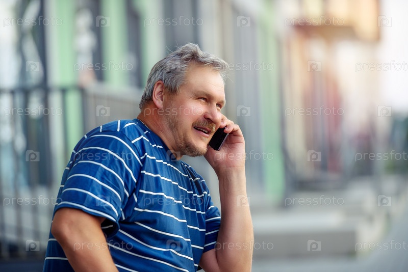 Взрослый красивый мужчина смеется и разговаривает по смартфону в городе