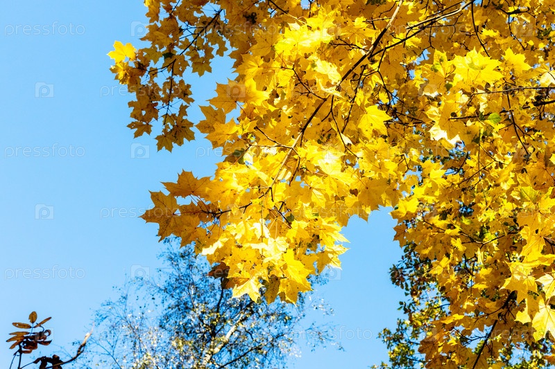 Ветка клена с желтыми листьями и голубым небом