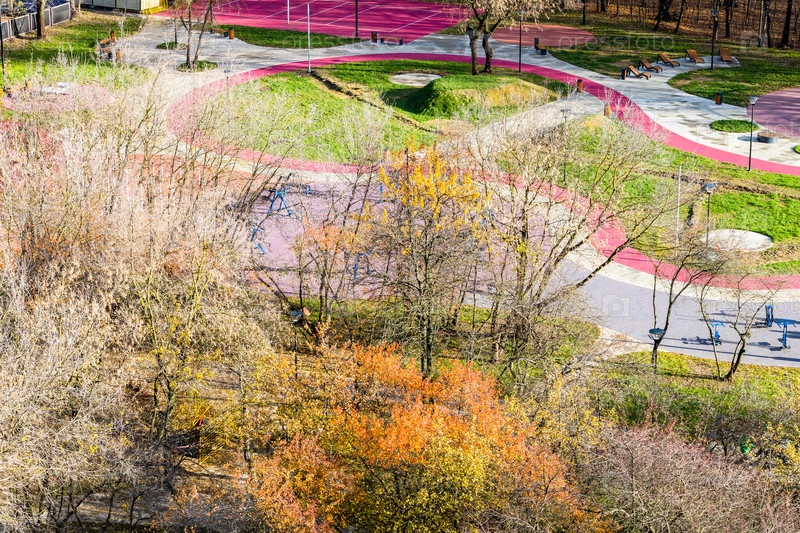 Вид сверху на спортивную площадку в красочном парке