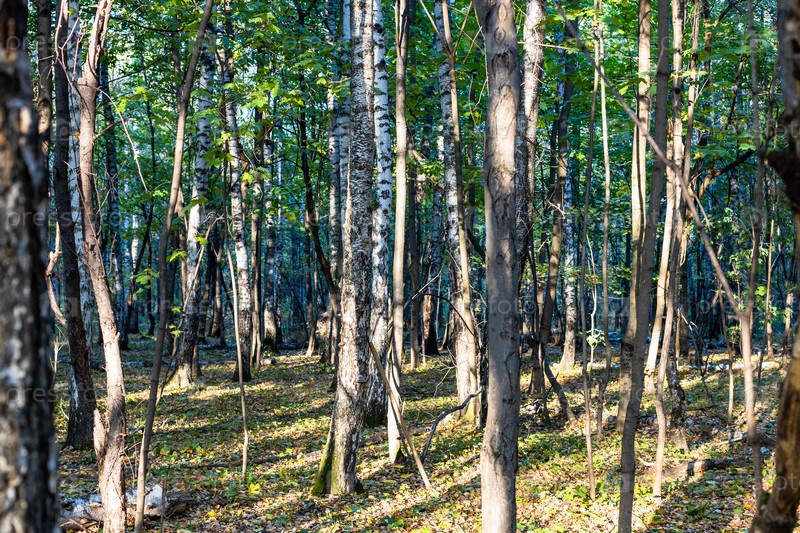 Стволы деревьев в городском парке в солнечный осенний день