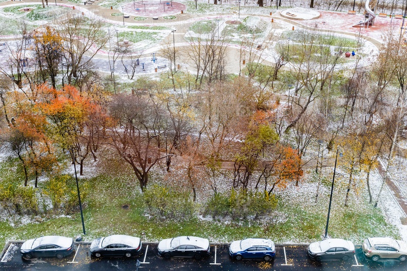 Машины возле спортивной площадки засыпаны первым снегом