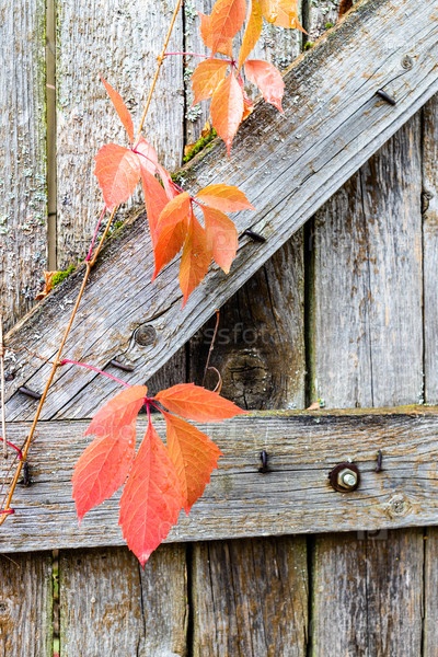 Красные осенние листья на старой деревянной калитке крупным планом